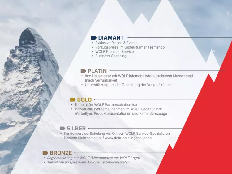 WOLF steht für eine gelebte Partnerschaft. Diese wollen wir weiter stärken und Sie für Ihr Engagement belohnen. Beim WOLF Partnerprogramm „Gipfelstürmer“ ziehen alle an einem Strang und kämpfen gemeinsam für den geschäftlichen Erfolg. Über die Installationsprämie und den Umsatzbonus haben Sie die Möglichkeit, doppelt zu punkten und können Ihren verdienten Bonus zu jeder Zeit im WOLF Teamshop gegen attraktive Prämien einlösen.
