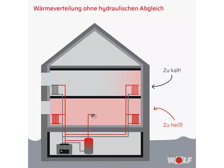 Ohne einen hydraulischen Abgleich der Heizung werden die der Heizungspumpe am nächsten gelegenen Heizkörper mit dem warmen Heizwasser überversorgt, während weiter weg gelegene Heizkörper unterversorgt sind.