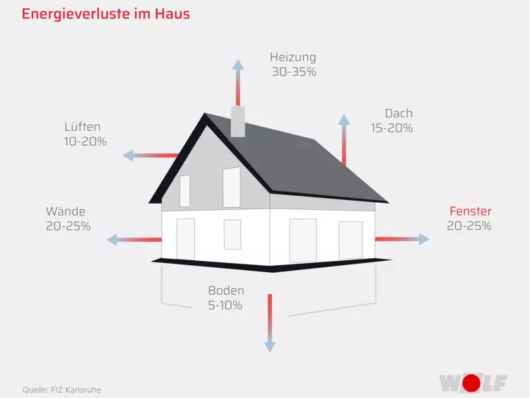 Da die Wärme ungenutzt an die Umgebung abgegeben wird, muss die Heizung mehr arbeiten und Energie verbrauchen. Die Grafik zeigt potenzielle Schwachstellen, durch die bei einem Gebäude Energie verloren gehen kann.