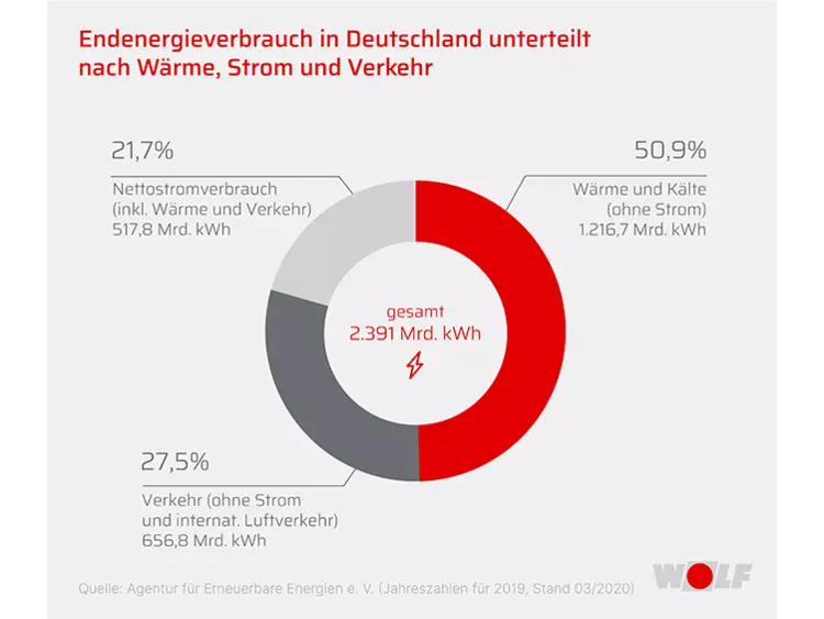 Denn wer einen Blick auf die Zahlen beim Energieendverbrauch wirft, stellt schnell fest, dass die Wärmeerzeugung (dazu zählen technisch gesehen die Raumheizung, die Warmwasserbereitung sowie eventuelle Kälteerzeugung) knapp die Hälfte des Energieverbrauchs ausmacht.