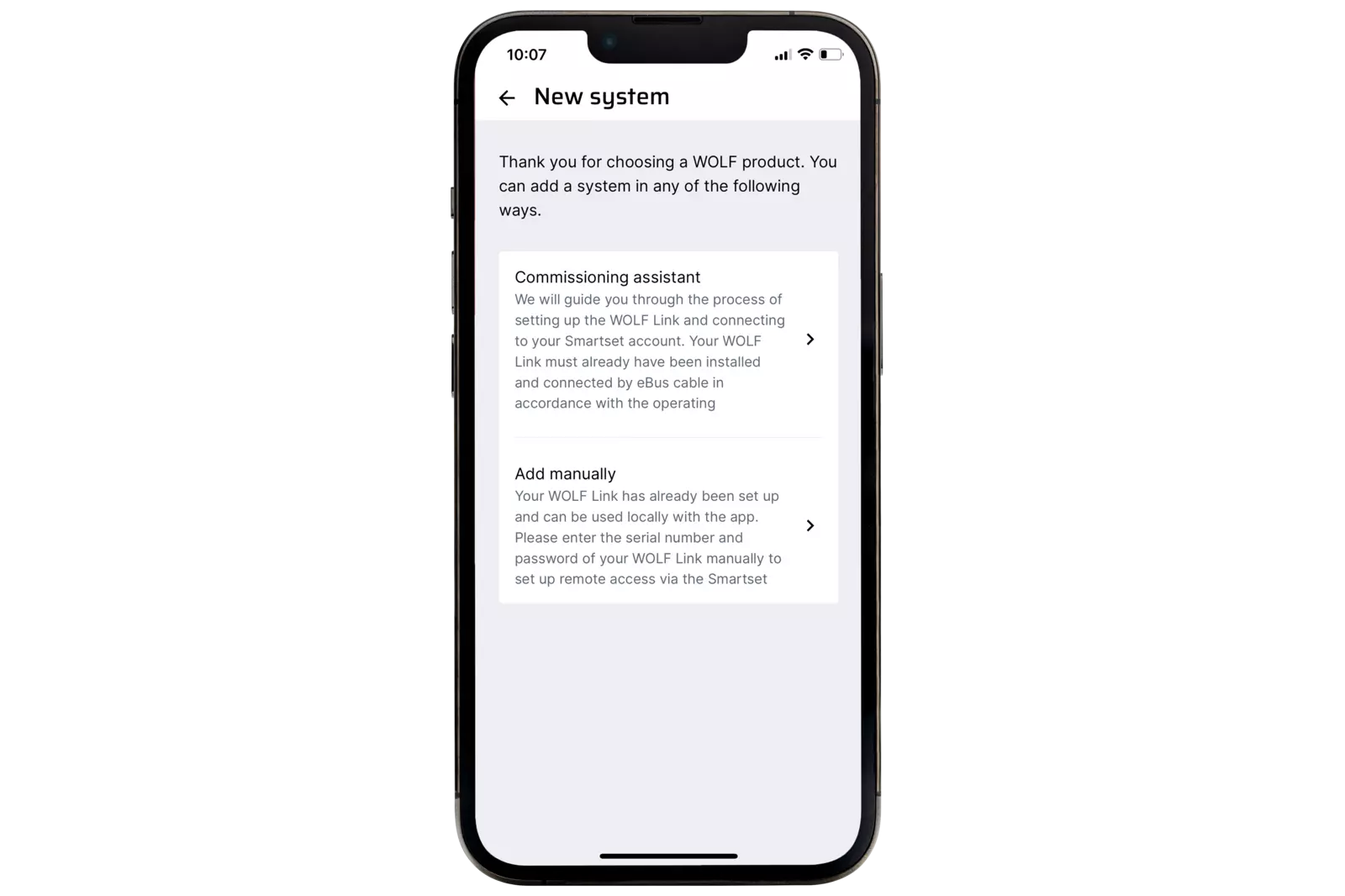 The integrated commissioning wizard in the Smartset app can be used to set up and connect the Smartset app to your system via WOLF Link. This guides you step-by-step through the set-up process via WLAN (WPS) or LAN. If these options do not work for you, this page also describes a manual way of establishing a connection.
