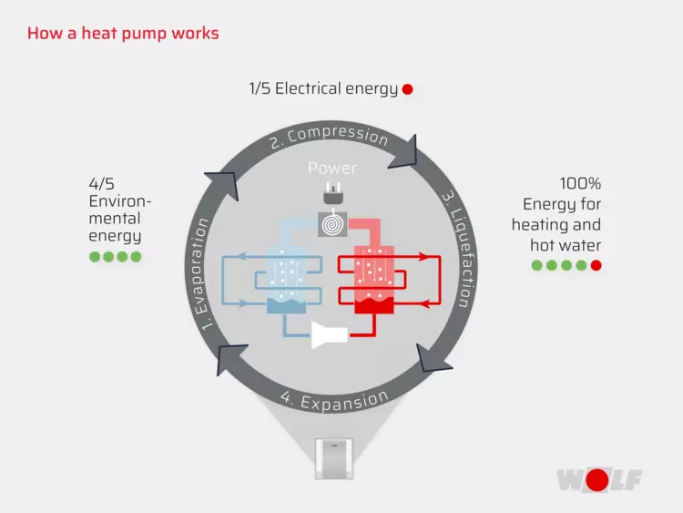 The COP depicts the relationship between the electrical energy required and the heat output of the pump. For example, if a heat pump has a COP of 4, this means that it generates four kilowatts of heat with one kilowatt of electricity. The difference between the remaining three kilowatts of energy comes from the ambient air.