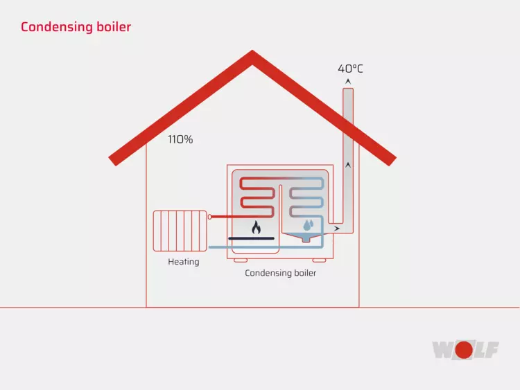 Boilers with condensing technology take advantage of the principle of condensation heat since when gas, oil or wood is burned, there is always a certain amount of water vapour in the flue gases. Depending on the fuel, the dew point at which the exhaust gases liquefy again differs, and therefore so does the heat that can be extracted.
