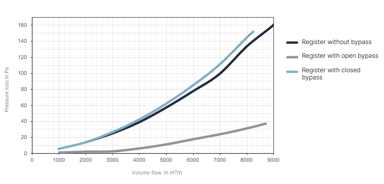 The space required for the bypass damper is created by the device protrusion. The ribbed register area remains the same, compared to the original situation