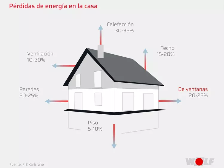 Puesto que el calor se puede escapar, el sistema de calefacción tiene que trabajar más y consumir más energía. El gráfico muestra los posibles puntos débiles a través de los cuales un edificio puede perder energía.