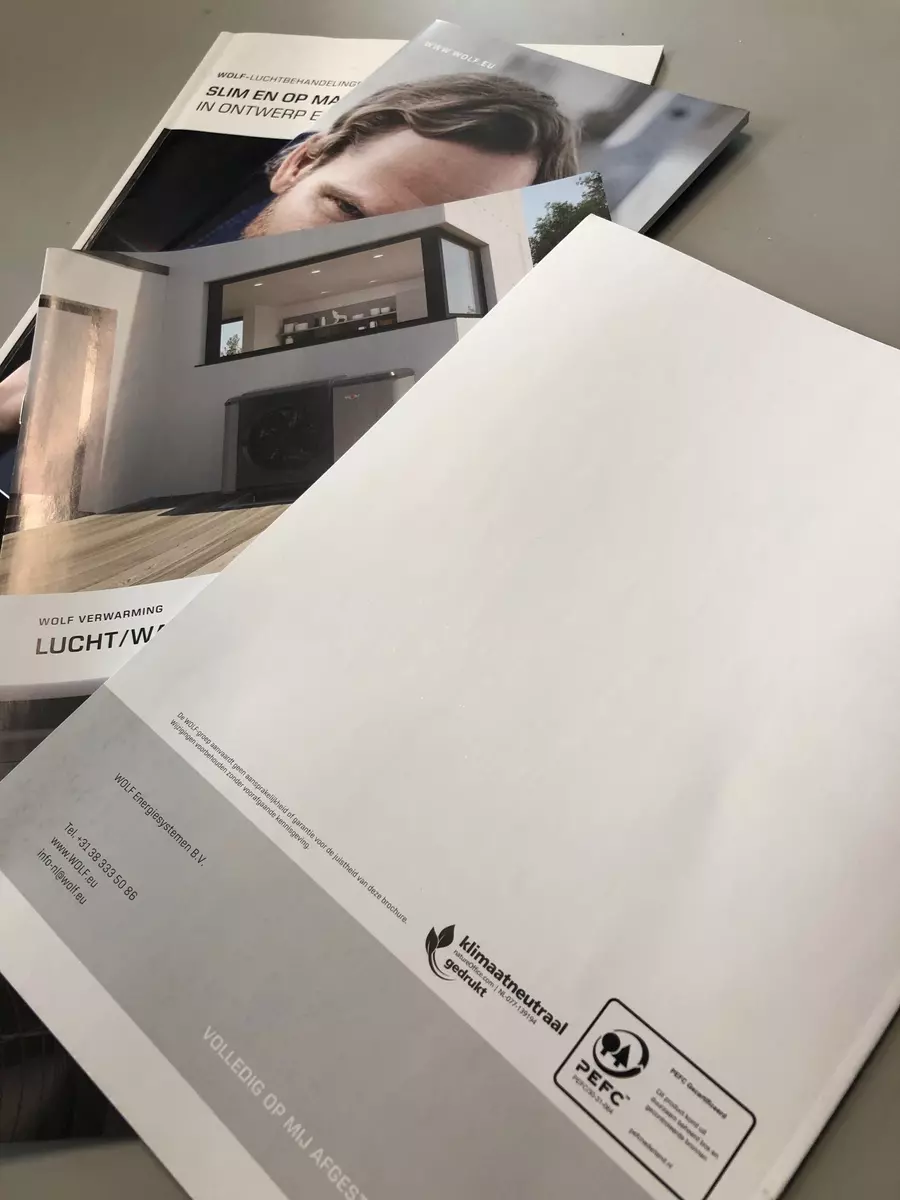 - Het verbruik van onze brochures, enveloppen en briefpapier reduceren we zoveel mogelijk. We maken gebruik van FSC of PEFC papier (verantwoorde herkomst) en er wordt klimaatneutraal gedrukt.