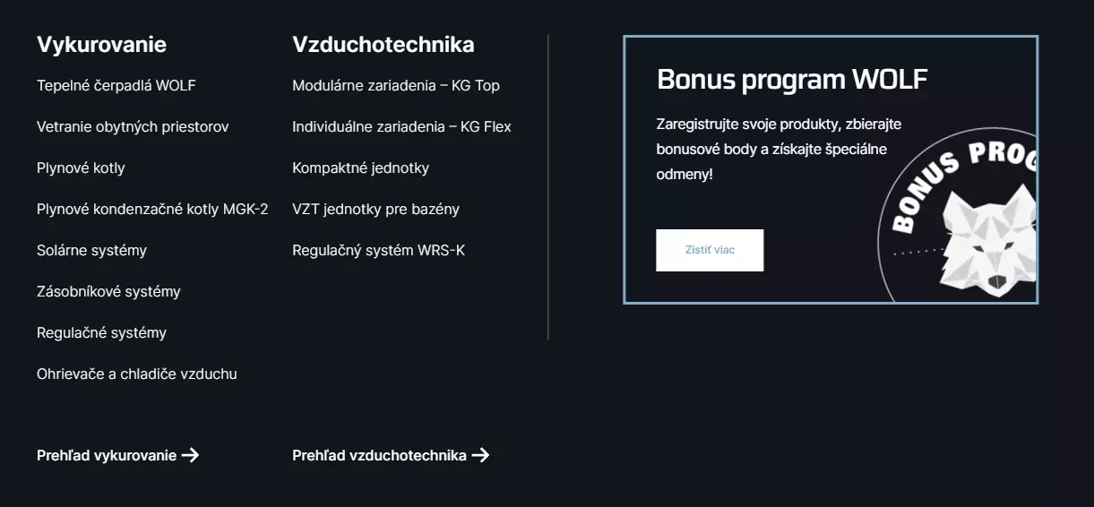 Štruktúra a navigácia novej firemnej webovej stránky boli špeciálne navrhnuté tak, aby spĺňali požiadavky jednotlivých skupín zákazníkov. Súkromný zákazník môže využiť konkrétnu pomoc pri hľadaní výrobku, ukážkové riešenia pre stavebný projekt, poradenstvo z oblasti vykurovania a vetrania alebo si nechať poradiť od odborného partnera WOLF. Prostredníctvom interaktívnych prvkov je zákazníkovi prezentovaný relevantný obsah a produkty zodpovedajúce jeho požiadavkám a sú mu sprostredkované kontakty na vhodných servisných partnerov alebo kľúčových zamestnancov WOLF.